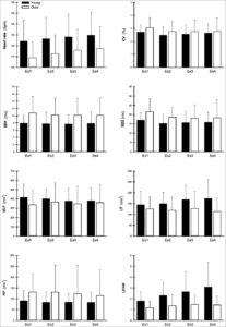 Eleven young (∼24 years) and 13 older (∼51 years), habitually active females completed an experimental session consisting of baseline rest, moderate intensity intermittent exercise (four 15-min bouts separated by 15-min recovery) and 1-hour of final recovery in a hot and dry (35°C, 20% relative humidity) environment. Respiratory and heart rate recordings were continuously logged with 10-min periods analysed at the end of: baseline rest; each of the exercise and recovery bouts; and during the 1-hour final recovery period.