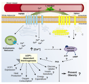 However, its role in l-menthol-induced UCP1-dependent thermogenic activity in BAT and WAT remains undetermined. White adipose tissue plasticity has important clinical implications for obesity prevention and/or treatment because higher levels of UCP1-dependent thermogenesis can lead to enhanced energy expenditure at a considerable extent. We hypothesize that chronic dietary l-menthol treatment could induce TRPM8- and TRPA1-dependent WAT adaptations, resembling BAT-like activity, and overall improve whole-body metabolic health in obese and overweight individuals.