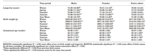 This study examined the effect of birth season on fetal development and longevity using two independent databases of all Greek citizens that were born (total: 516,874) or died (total: 554,101) between 1999 and 2003. We found significantly increased birth weight, gestational age, and longevity in individuals born during the autumn and winter seasons of the year. These individuals also demonstrated statistically significantly lower prevalence rates for fetal growth restriction and premature birth. Furthermore, we found that increased temperature at birth was associated with adverse effects on fetal development and longevity. In conclusion, our results show strong effects of season of birth on fetal development and longevity mediated, at least in part, by environmental temperature at time of birth.
