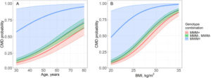 The present results suggest that age, BMI, sex, and UCP1 three-SNP combinations of genotypes significantly contribute to CMD probability. Varying of c.-112A>C alleles in the genotype combination with minor alleles of c.-3826A>G and p.Ala64Thr markedly changes CMD probability.
