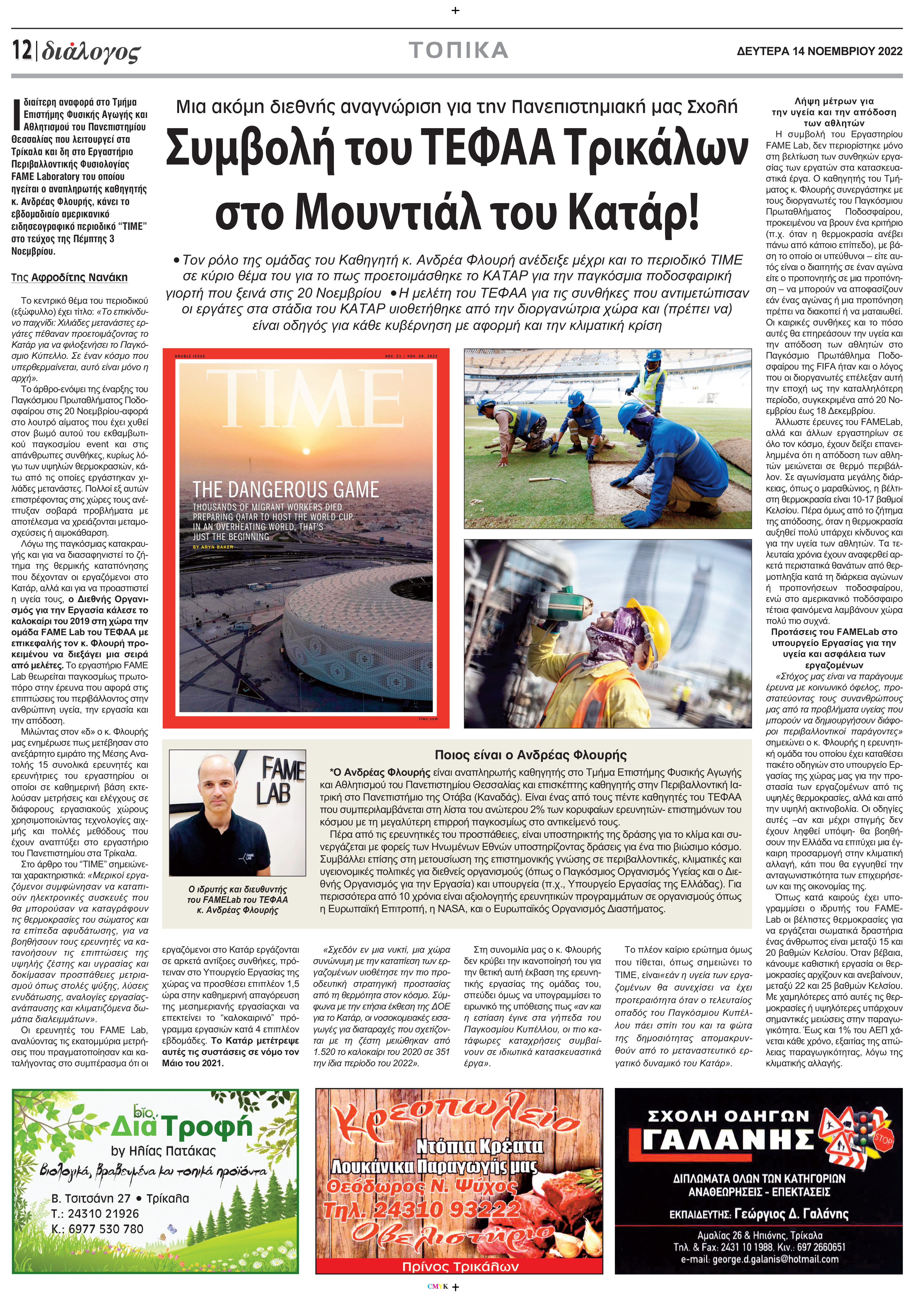 Ιδιαίτερη αναφορά στο Τμήμα Επιστήμης Φυσικής Αγωγής και Αθλητισμού του Πανεπιστημίου Θεσσαλίας που λειτουργεί στα Τρίκαλα και δη στο Εργαστήριο Περιβαλλοντικής Φυσιολογίας FAME Laboratory του οποίου ηγείται ο αναπληρωτής καθηγητής κ. Ανδρέας Φλουρής, κάνει το εβδομαδιαίο αμερικανικό ειδησεογραφικό περιοδικό “TIME” στο τεύχος της Πέμπτης 3 Νοεμβρίου.