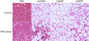 Methods: LPHC (6% protein, 74% carbohydrate) or control (C; 17% protein, 63% carbohydrate) diets were administered to rats for 15 d. The tissues were stained with hematoxylin and eosin for histologic analysis. The content of uncoupling protein 1 (UCP1) was determined by immunofluorescence. Levels of T-box transcription factor (TBX1), PR domain containing 16 (PRDM16), adipose triacylglycerol lipase (ATGL), hormone-sensitive lipase, lipoprotein lipase (LPL), glycerokinase, phosphoenolpyruvate carboxykinase (PEPCK), glucose transporter 4, β3-adrenergic receptor (AR), β1-AR, protein kinase A (PKA), adenosine-monophosphate-activated protein kinase (AMPK), and phospho-AMPK were determined by immunoblotting. Serum fibroblast growth factor 21 (FGF21) was measured using a commercial kit (Student’s t tests, P < 0.05).