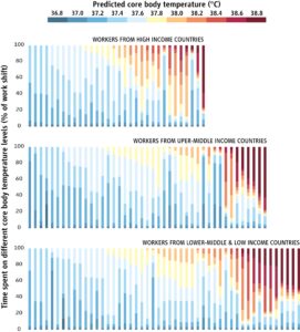 Our findings show that migrant workers originating from LMICs experience higher levels of occupational heat strain, as compared to migrant workers from UMICs and native workers from HICs, because they take fewer unplanned breaks during work, they work at a higher intensity, they wear more clothing, and they have a smaller body size.