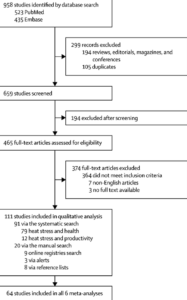 Flouris AD, Dinas PC, Ioannou LG, Nybo L, Havenith G, Kenny GP, Kjellstrom T. Workers’ health and productivity under occupational heat strain: a systematic review and meta-analysis. Lancet Planet Health. 2018 Dec;2(12):e521-e531. doi: 10.1016/S2542-5196(18)30237-7. PMID: 30526938.